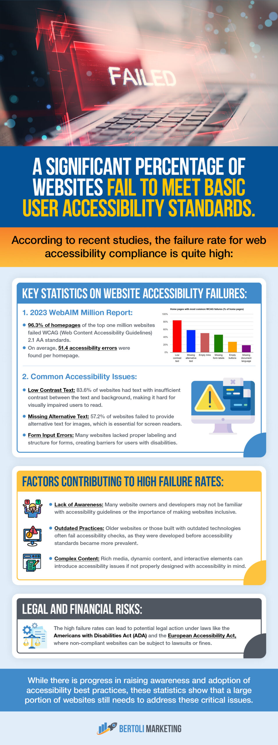 - Outdated Practices: Older websites or those built with outdated technologies often fail accessibility checks, as they were developed before accessibility standards became more prevalent.