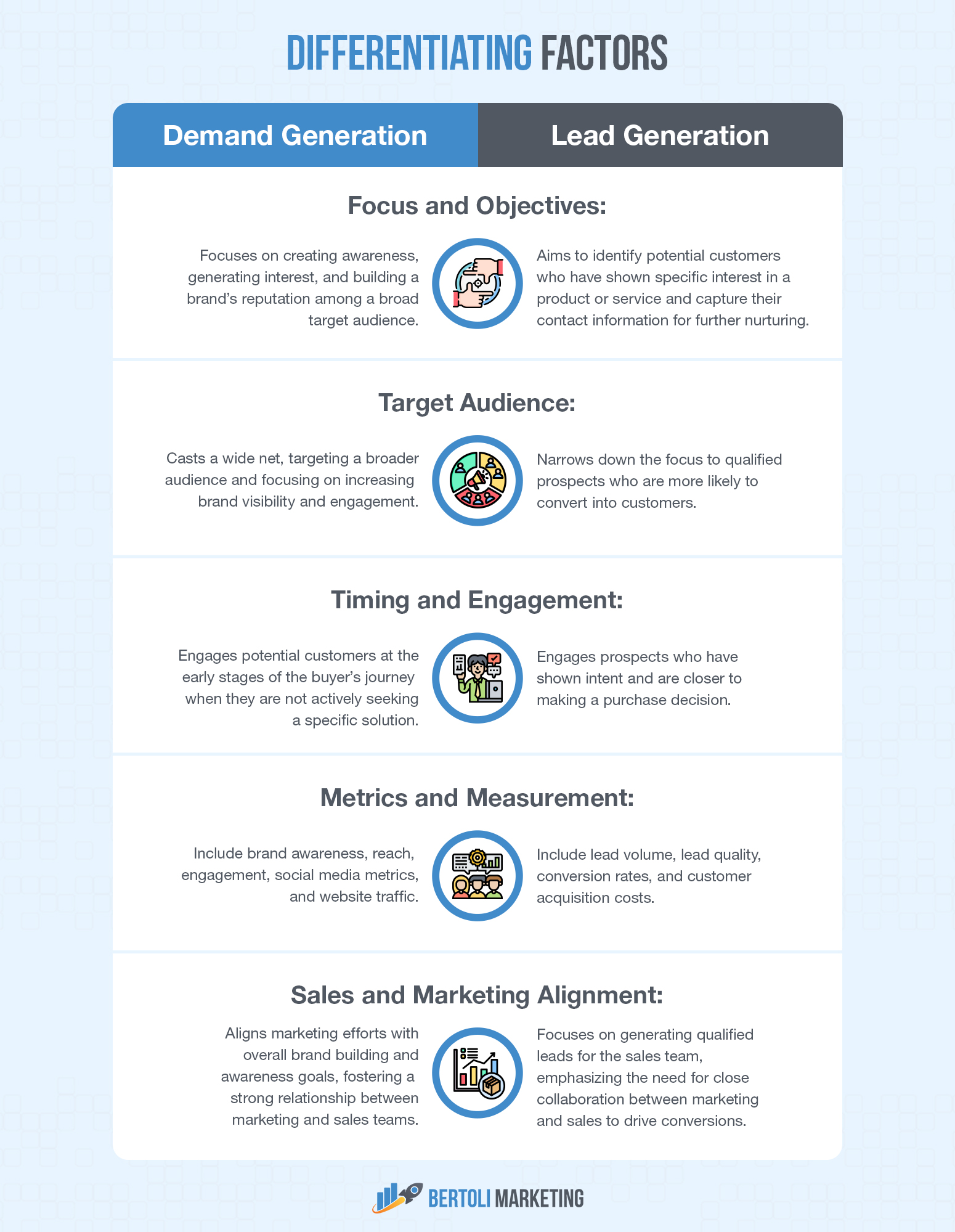 While demand generation and lead generation share the common goal of driving business growth, they differ in several key aspects, including Focus & Objectives, Target Audience, Timing & Engagement, Metrics & Measurement, and Sales & Marketing Alignment.