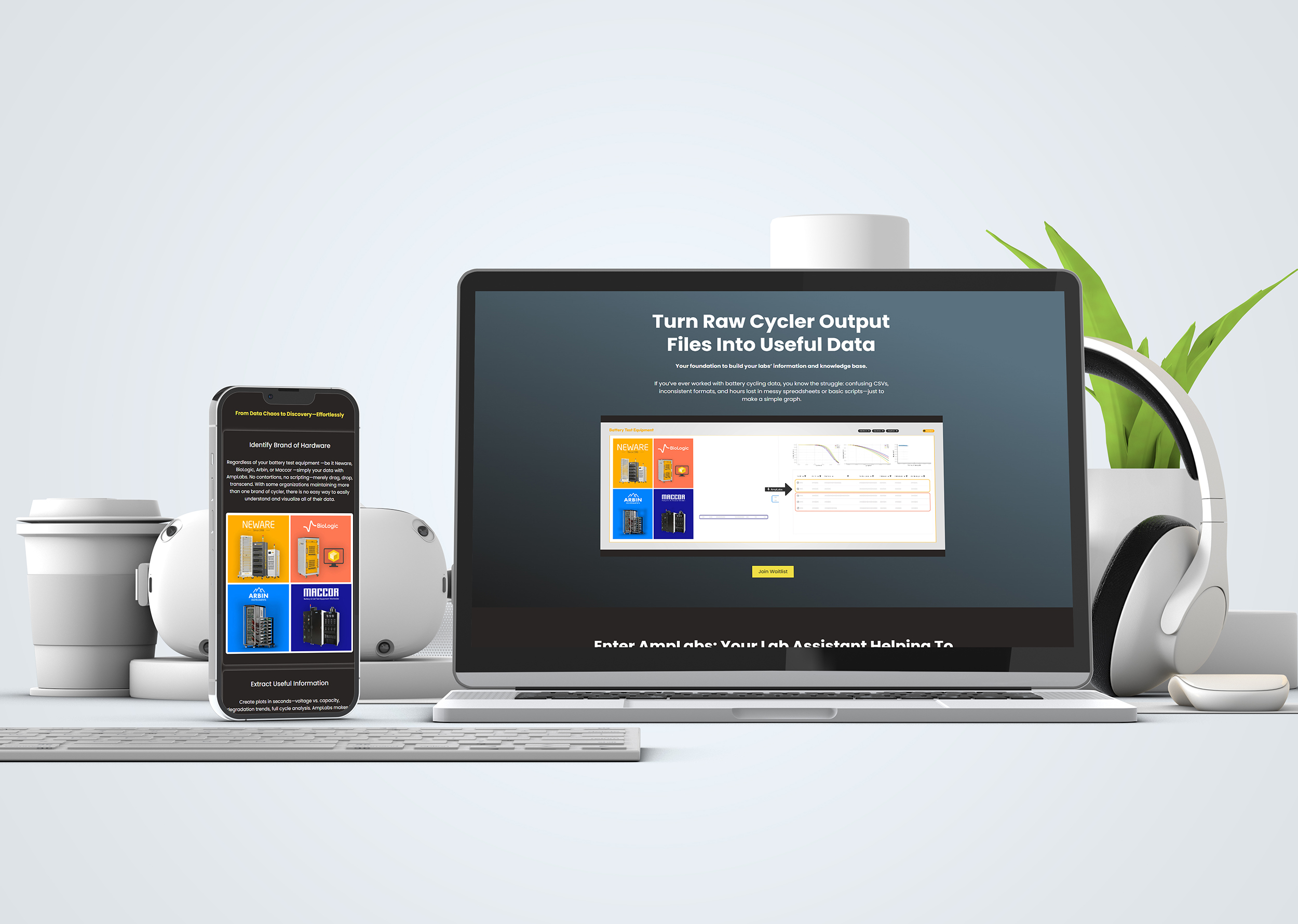The redesigned website introduced a clean, professional design with clear messaging around the platform’s ability to simplify complex battery data workflows. Structured content highlights compatibility with leading battery test equipment providers and communicates how AmpLabs streamlines data management, saving hours of manual work. To drive early adoption, Bertoli Marketing built a waitlist and sign-up funnel directly into the site, giving visitors an easy way to engage with the brand and express interest in the platform prior to launch.